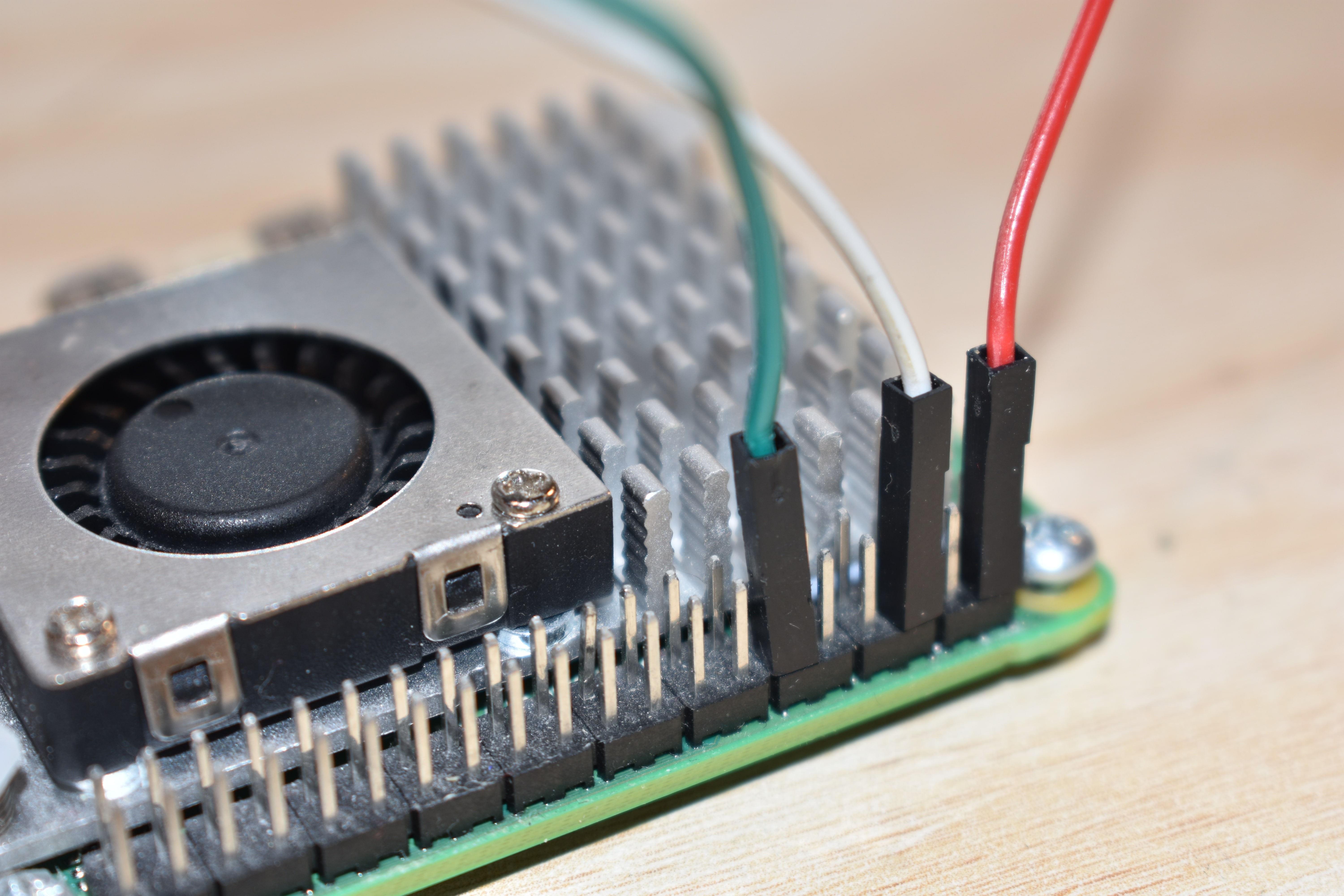 Connect the Red wire to Pin 2 (5V). Connect the White wire to Pin 6 (GND). Connect the Green wire to Pin 12 (GPIO 18 | CLK | PCM). Once finished, your wiring should look like this: