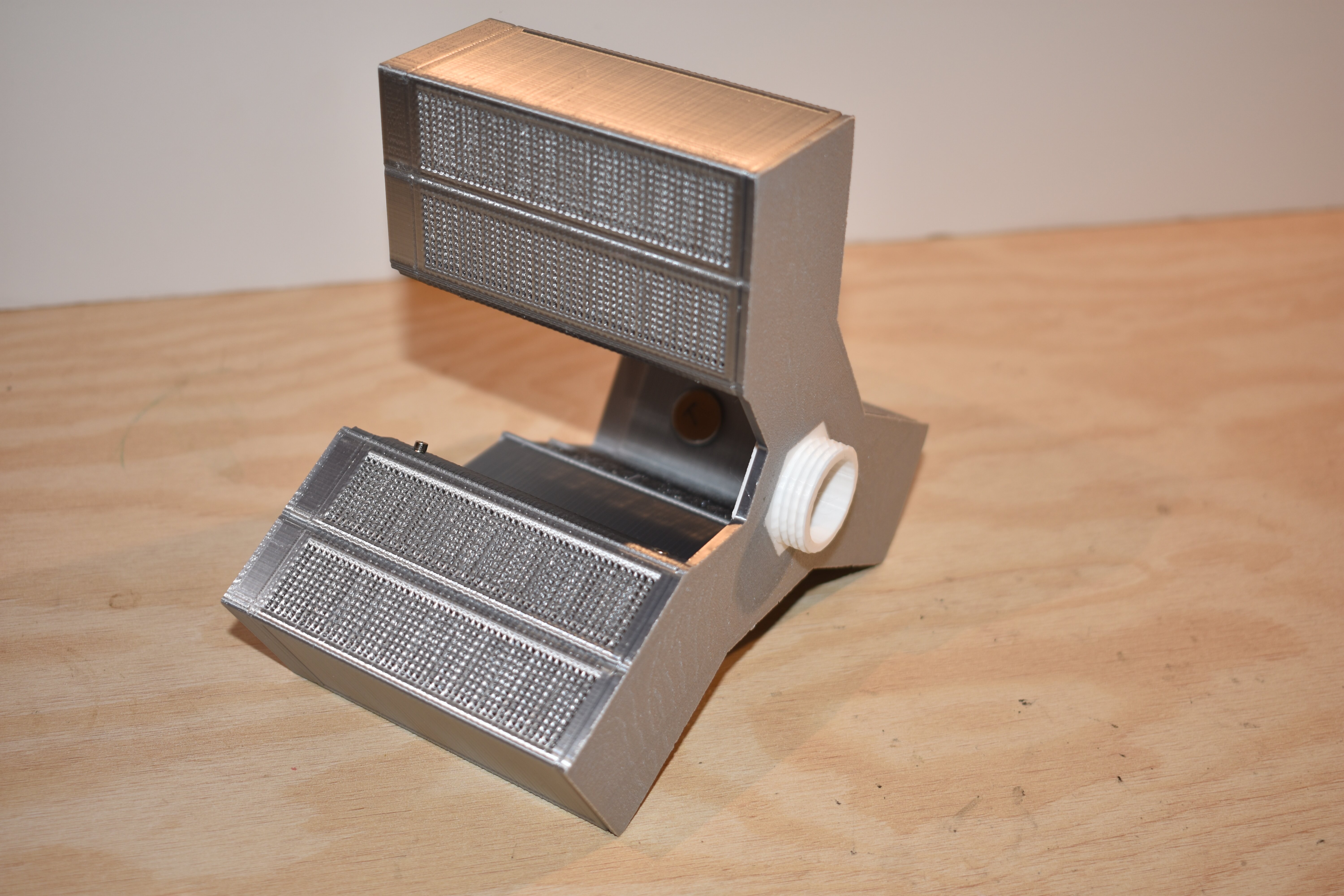 The Door (R2_NewDoor) should be printed upright, so that the layer lines align, but may require a brim for stable printing. It and the server's door frame each require very small magnets for it to close securely... see the notes below on best practices for installing those.
