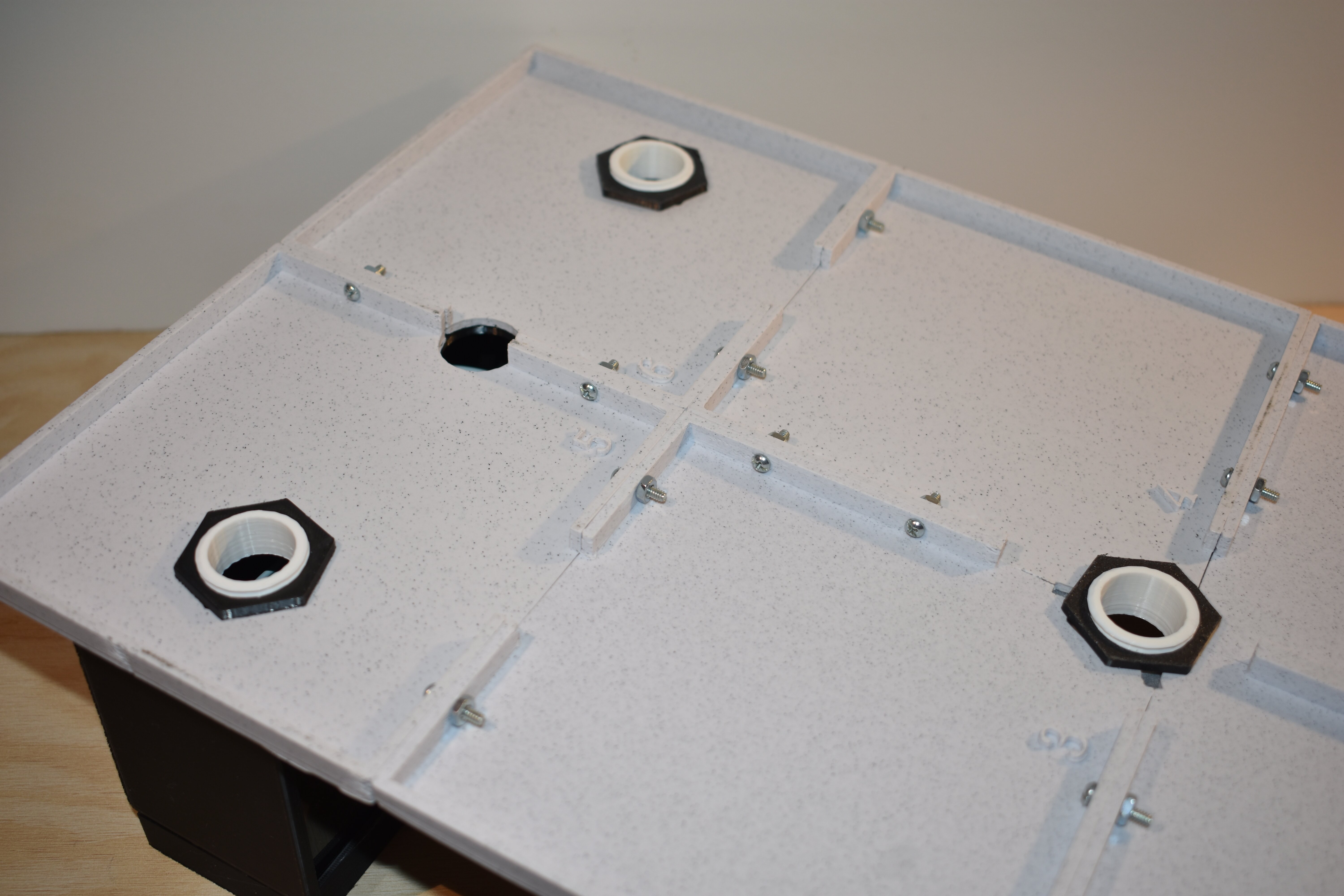 Each floor tile has two holes on each side where it connects to another floor tile. To connect the floor tiles together, line up two floor panels together so that the holes are in alignment. Insert an M3 Bolt (or #4 bolt in the US) through the hole and thread the nut onto the bolt until tightened. Reapeat the process to connect all of the panels together, making sure to preserve the correct order of panels as shown in the above image. We have found that holding the nut with a pair of pliers and using an allen key to tighten the bolt helps make the process easier, given the small space available beneath the floor tiles.