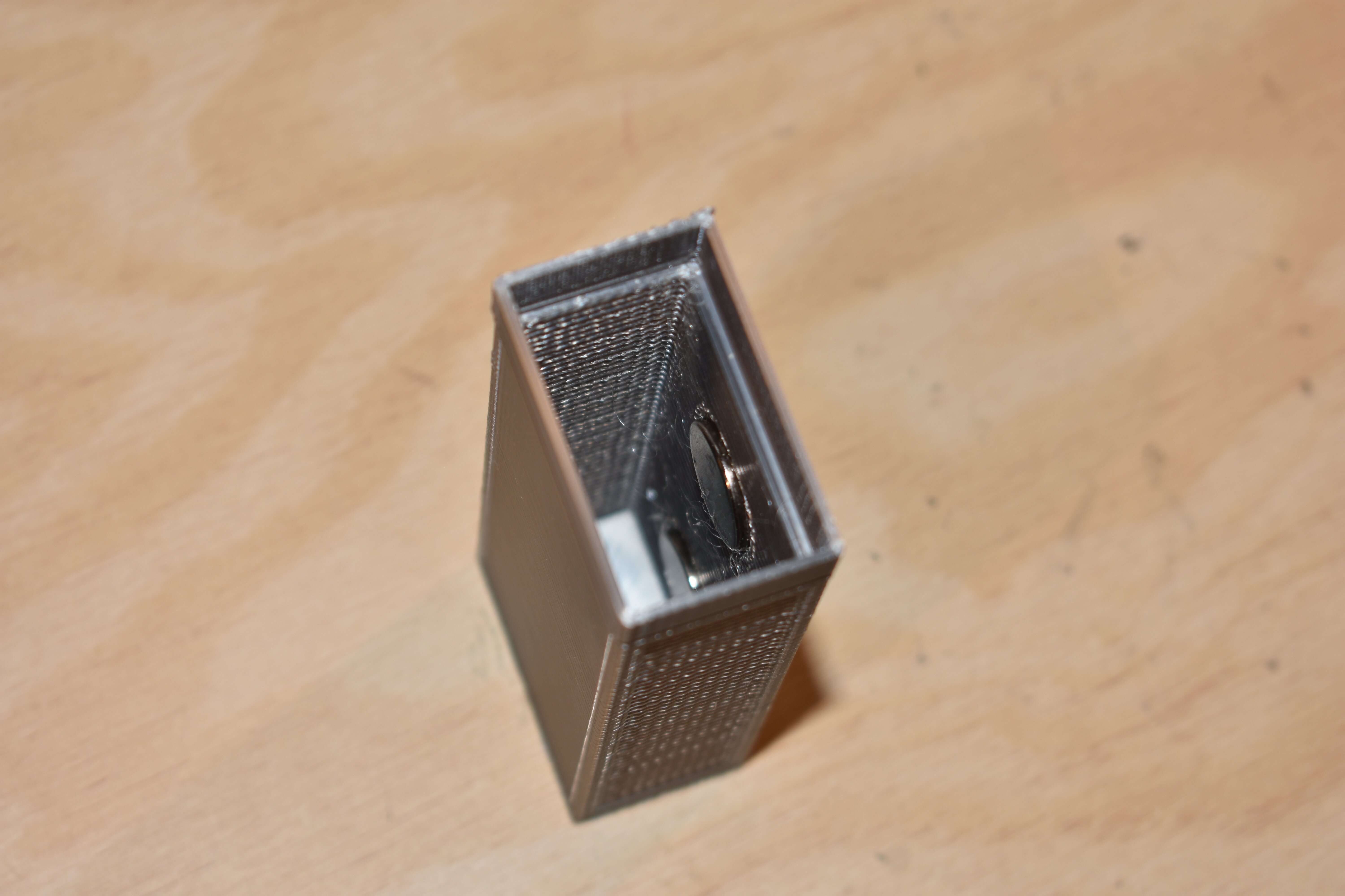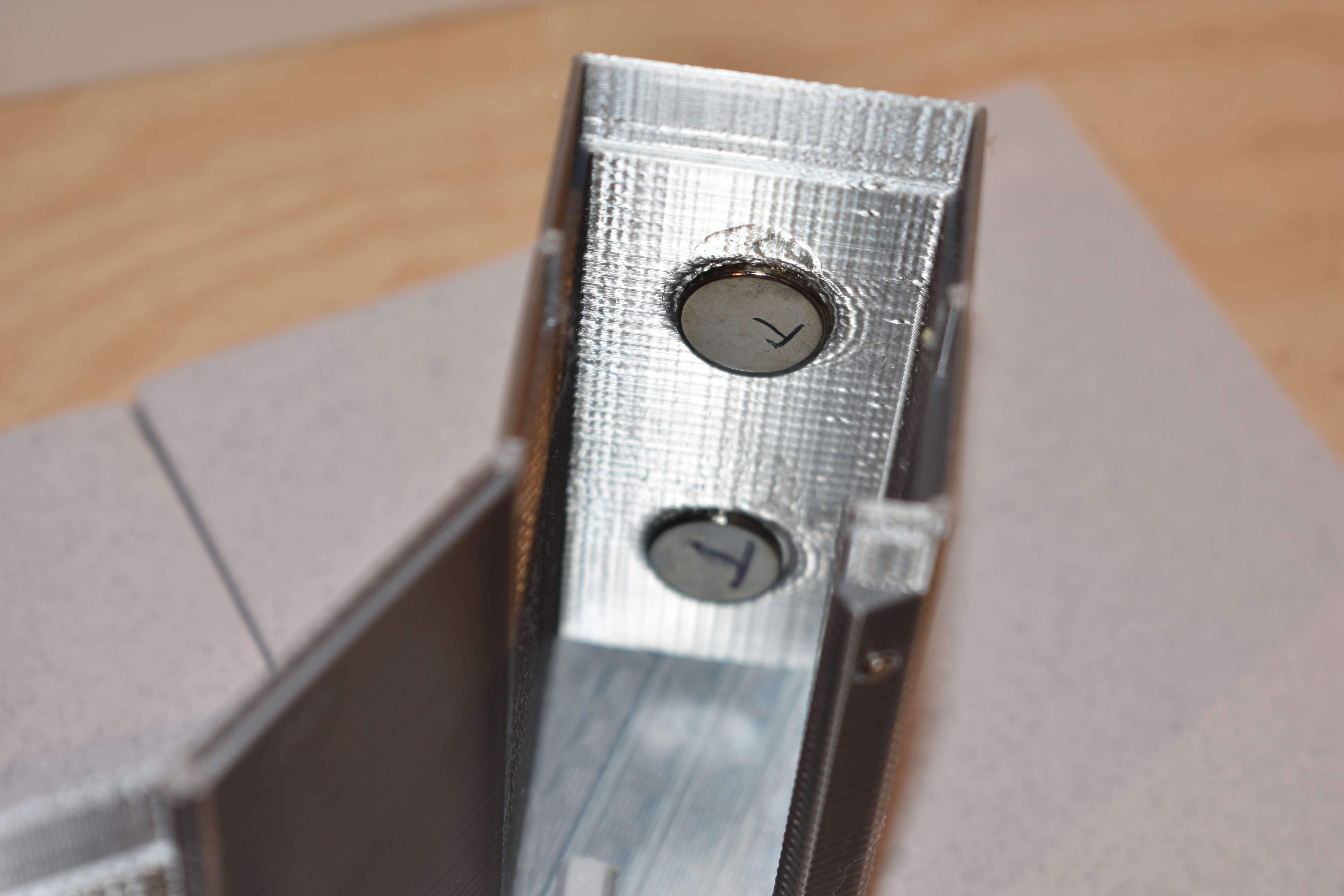 Attach another magnet to the back of the plastic wall to keep the magnet in place while the glue dries (about half an hour). Leave plenty of time for the glue to dry before assembling magnetic joints, so the magnets don’t pull out.